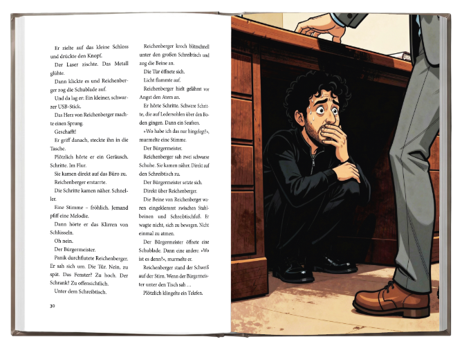 Der Bürgermeister kommt ins Büro. Setzt sich an den Schreibtisch. Direkt über ihm. Er hält den Atem an, eingeklemmt unter dem Tisch, und hofft, dass niemand nach unten schaut.